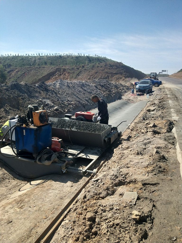 看下這個現(xiàn)場,高速公路的排水溝在公路的坡下,這就造成了增大上料花費的問題,因為坡度大,垂直高度也大。只能選擇采用吊車上料。普通的情況下如果和道路挨著,罐車是可以往機器里面卸料的。而如今這個現(xiàn)場,只能通過罐車放料到漏斗里面,吊車吊著漏斗去給機器上料。雖然有點耽誤時間,但是總體算下,使用機械施工的速度還是人工施工的好幾倍。