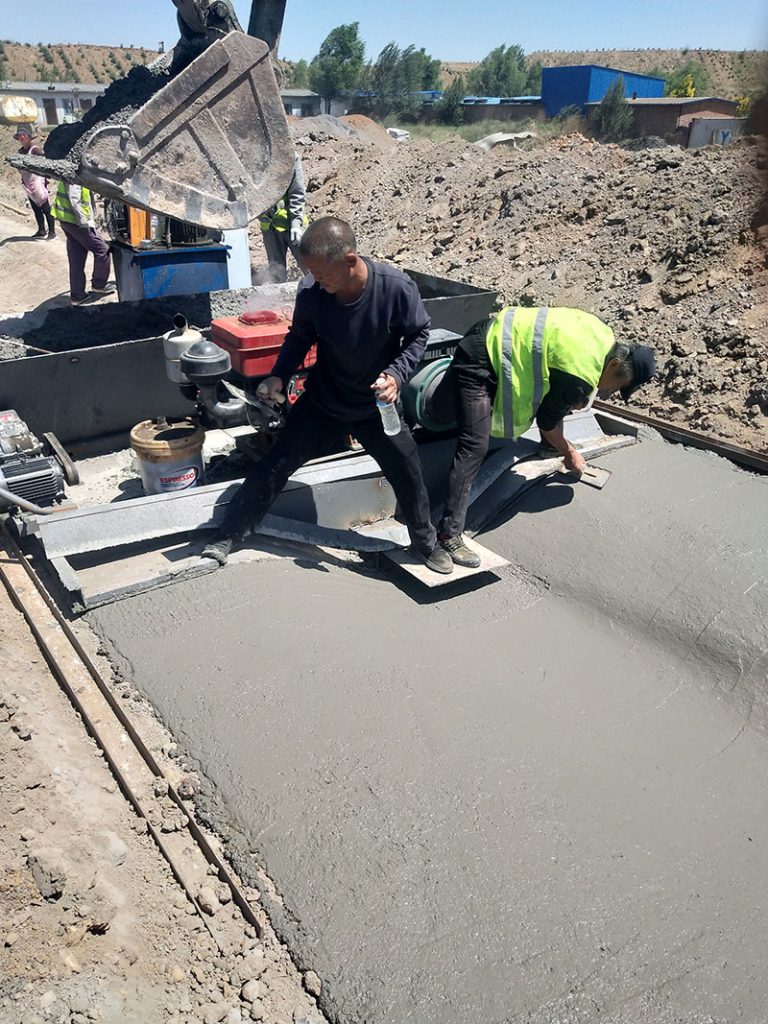 因為使用商混的緣故,混凝土的塌落度較高,所以收光工作比較容易,一個人在收光板板上即可完成,雖然機器的速度略顯的有些慢但是成型的效果還是很客觀的。這臺設(shè)備只調(diào)試了半天,根據(jù)現(xiàn)場的試機數(shù)據(jù)一個小時完成了38米的水渠。這么好的效果,38米也是不錯的了。也許用全自動的水渠機一個小時可以完成60米,但是全自動的水渠滑模機對商混不是太友好。而且這個客戶對工作效率的要求不高,所以說,這是一次愉快的調(diào)試過程。時間少,客戶也滿意。