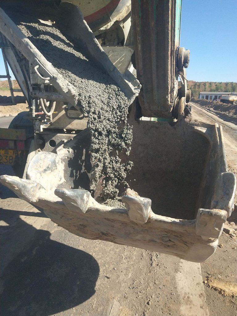 機器是用罐車進行混凝土運輸,挖掘機輔助上料。罐車來到現(xiàn)場以后,把料放到挖掘機的挖斗中,挖掘機跟著機器負責(zé)上料。這個現(xiàn)場經(jīng)過一天的調(diào)試做了大概210米,如果后期罐車的料不耽誤無一天預(yù)計能做350米左右。